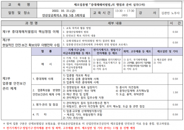 * 교육내용: 중대재해처벌법의 쟁점과 준비 실무/기계·기구·자동차·비금속광물 제품 제조업종